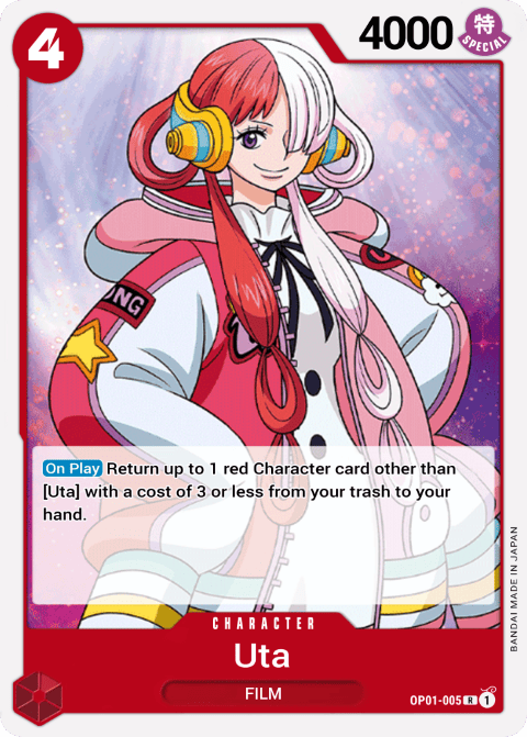 [On Play] Add up to 1 red Character card other than [Uta] with a cost of 3 or less from your trash to your hand.
