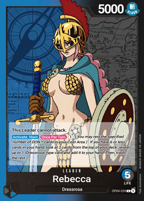 [Activate: Main] [Once Per Turn] ? (You may rest the specified number of DON!! cards in your cost area.): If you have 6 or less cards in your hand, look at 2 cards from the top of your deck; reveal up to 1 {Dressrosa} type card and add it to your hand. Then, trash the rest.