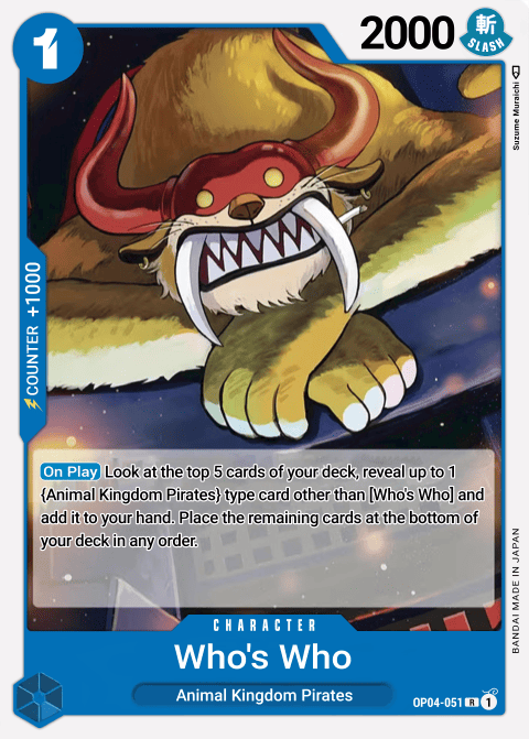 [On Play] Look at 5 cards from the top of your deck; reveal up to 1 {Animal Kingdom Pirates} type card other than [Who's.Who] and add it to your hand. Then, place the rest at the bottom of your deck in any order.