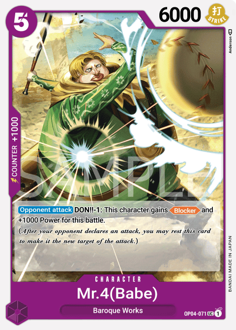 [On Your Opponent's Attack] DON!! ?1 (You may return the specified number of DON!! cards from your field to your DON!! deck.): This Character gains [Blocker] and +1000 power during this battle.