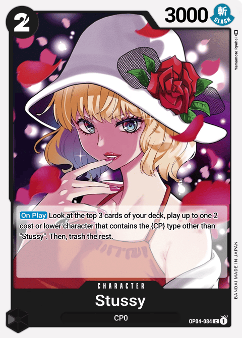 [On Play] Look at 3 cards from the top of your deck and play up to 1 Character card with a type including "CP" other than [Stussy] and a cost of 2 or less. Then, trash the rest.