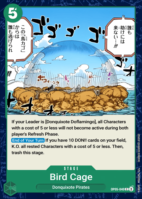 If your Leader is [Donquixote Doflamingo], all Characters with a cost of 5 or less do not become active in your and your opponent's Refresh Phases.