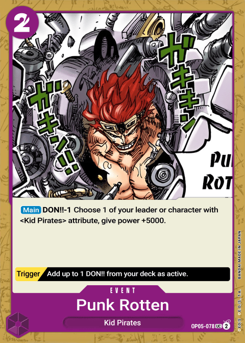 [Main] DON!! ?1 (You may return the specified number of DON!! cards from your field to your DON!! deck.): Up to 1 of your {Kid Pirates} type Leader or Character cards gains +5000 power during this turn.