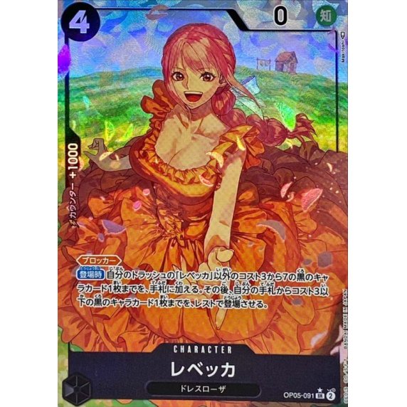 [On Play] Add up to 1 black Character card with a cost of 3 to 7 other than [Rebecca] from your trash to your hand. Then, play up to 1 black Character card with a cost of 3 or less from your hand rested.