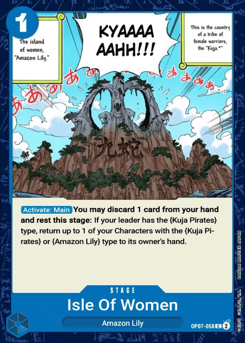 [Activate: Main] You may trash 1 card from your hand and rest this Stage: If your Leader has the {Kuja Pirates} type, return up to 1 of your {Amazon Lily} or {Kuja Pirates} type Characters to the owner's hand.